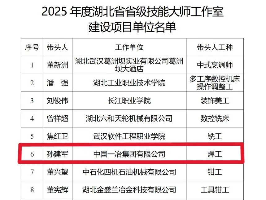 近日,湖北省人力資源和社會保障廳公布了2025年省級技能大師工作室建設(shè)項目名單,中國一冶鋼構(gòu)公司孫建軍技能大師工作室成功入選。